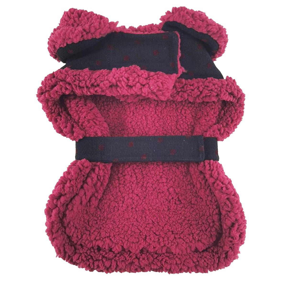 Black wool and burgundy dots with thick, warm and soft fleece fur collar and lining. This coat features touch fastener neck and chest closures. It includes a matching leash and a D-ring for easy leash attachment. Made with high-quality cotton/polyblend outer. We've continued the quality with double box stitch reinforced D-ring attachments.